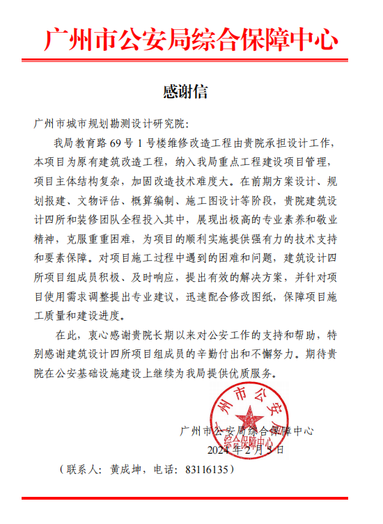 近日,廣州市公安局綜合保障中心發來感謝信,衷心感謝規劃院和我公司對教育路 69 號 1 號樓維修改造工程設計工作的支持,對我公司裝修設計團隊在室內方案設計及施工圖設計階段展現出的專業能力和敬業精神,保障了項目...